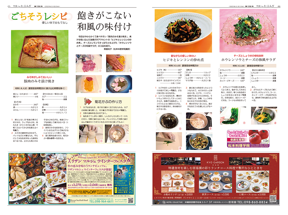 | 06-07P | [ごちそうレシピ]飽きがこない和風の味付け ①みそ味がしみしみで肉やわらか「豚肉のみそ漬け焼き」 ②煮汁を吸った油揚げがアクセント「ヒジキとレンコンの炒め煮」 ③チーズとしょうゆの相性抜群「ホウレンソウとチーズの和風サラダ」 |