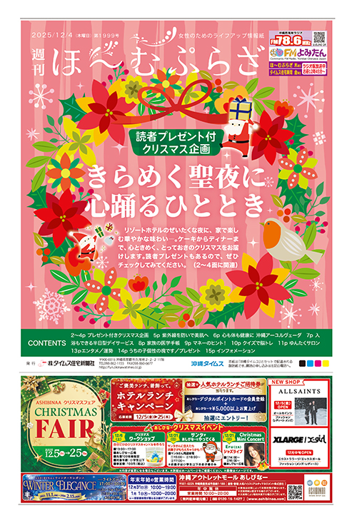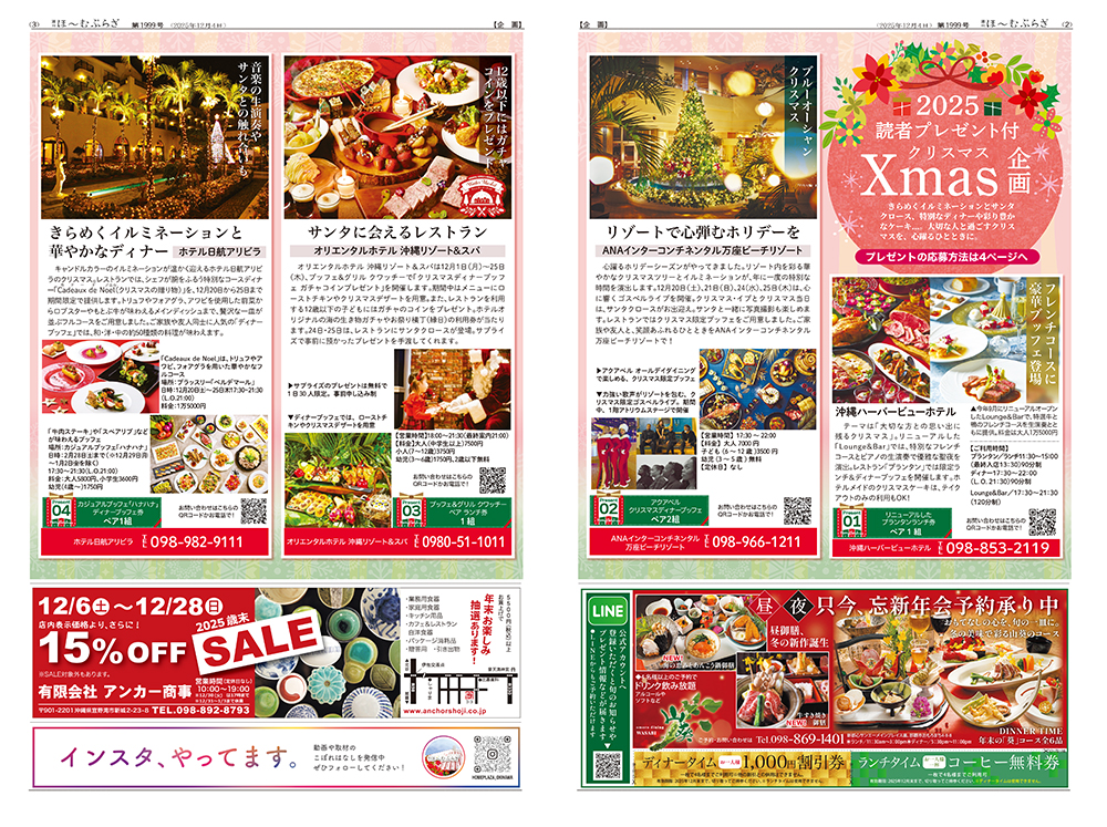 | 01-04P | [読者プレゼント付き!クリスマス企画2025]沖縄のリゾートホテル4施設・洋菓子店1店舗 きらめく聖夜に心躍るひととき ①フレンチコースに 豪華ブッフェ登場|沖縄ハーバービューホテル ②ブルーオーシャンクリスマス|ANAインターコンチネンタル万座ビーチリゾート ③サンタに会えるレストラン|オリエンタルホテル 沖縄リゾート&スパ ④きらめくイルミネーションと華やかなディナー|ホテル日航アリビラ ⑤とっておきのクリスマスケーキを|エーデルワイス沖縄 デパートリウボウ店 |