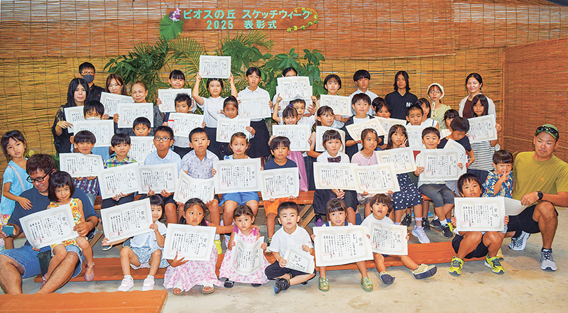 絵画コンクール「ビオスの丘スケッチウィーク2025」の表彰式が9月27日、うるま市のビオスの丘で行われた=写真。1歳から成人まで448点の応募があり、71点が入賞した。入賞作品は10月31日(金)までビオスの丘内にあるガーデンセンターで展示される。