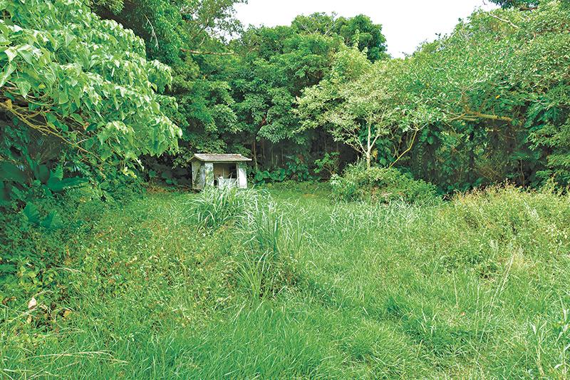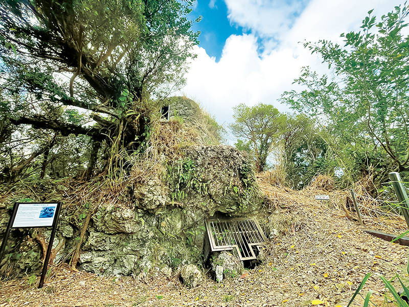 ハンタ道の道沿いには史跡が点在している。拝所「キシマコノ嶽」もその一つ。大岩が御嶽として信仰され、戦前までは豊作祈願などが行われていた。この付近は奥間集落発祥の地といわれている。山奥にあり往来が不便なため現在の集落の近くに設けた「お通し」(遥拝所)から拝んでいる。沖縄戦では旧日本軍によってこの一帯に陣地が構築された。「大岩の上には北谷、宜野湾、中城海岸方面を見張る監視哨が造られ、壁面は米軍に発見されないように自然石をモルタルで接着しました」
