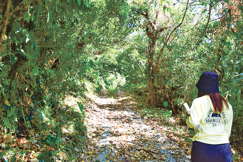 中城村内を南から北へ通る「ハンタ道」は15世紀、琉球王府と各地を結ぶ幹線道路(宿道)として整備された古道。地元の歴史に詳しい比嘉薫さんは「山々に沿って続く道の付近には、集落発祥の地にある御嶽やグスクなどの史跡が点在していて、歴史の道として散策が楽しめます。終点は護佐丸やそれ以前の按司たちによって築かれた中城グスクです」と説明する。