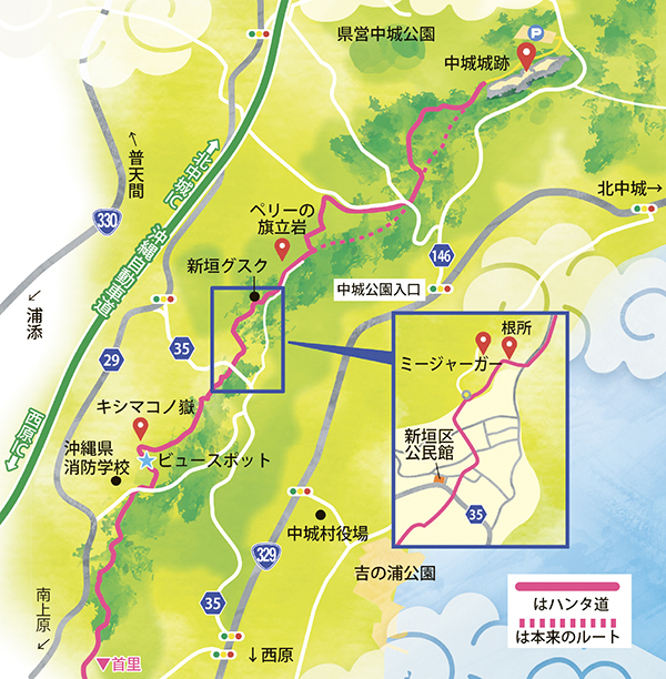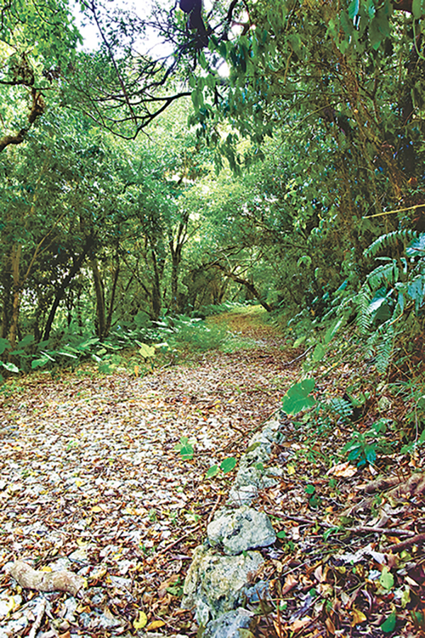 首 里城を起点に中城グスクや勝連グスクなどを結ぶ古道「中頭方東海道」は、15世紀に王府と各地を結ぶ幹線道路(宿道)として整備された。中城村内を通るこの道は、山の尾根や崖沿いを通っていることから「ハンタ道(ハンタは沖縄の言葉で崖や尾根を意味する)」と呼ばれていて、その道のりは中城村南上原から中城城跡までの全長約6㌔におよぶ。現在は、歴史の道として大半が整備済みだ。