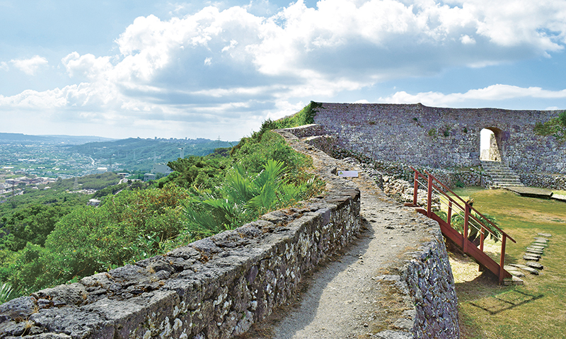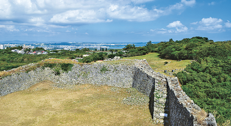 ハンタ道の終点である中城グスクは、東シナ海と中城湾を望む標高約160㍍の石灰岩丘陵にある。「厚い岩盤の上に城壁を築いた天然の要害です。約300余りあるとされる沖縄のグスクの中で最も遺構がよく残っています」