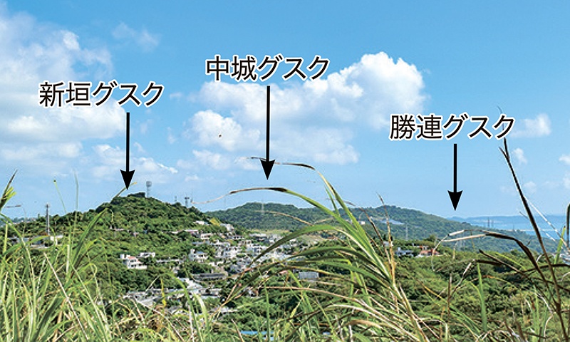 比嘉さんおすすめのハンタ道のビュースポット。三つのグスクが見渡せる(上地図参照)。 左から新垣グスク、中城グスク、勝連グスク