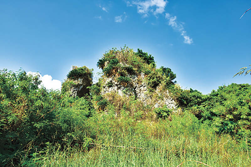 新垣にある「ペリーの旗立岩」。1853年に琉球に来訪した米国のペリー艦隊の中から組織された探検隊がこの場所に立ち寄り、大岩の上に星条旗を立てて岩山征服の祝砲を撃ったという記録が残されている。地元では「ターチャーイシ(二つ岩)」とも呼ばれている