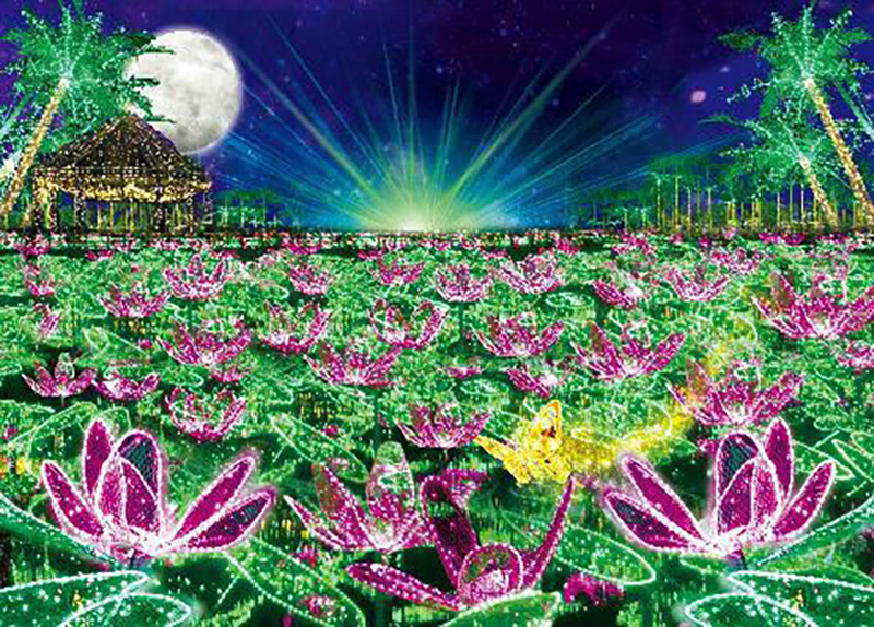蓮(はす)池を幻想的に彩る「ひかりの蓮」=写真=をはじめ、約20㍍のジンベエザメが泳ぐ沖縄らしい海の世界を演出した「ひかりの海」など見どころいっぱい。新しく、光るクラゲが漂う幻想的なエリアや、深紅の花束とプレゼントが光に包まれるエリアが登場。同園は、夜景観光士が選ぶ「インターナショナルイルミネーションアワード イルミネーションイベント部門」で2年連続全国2位を受賞している。入園料は、15歳以上2500円、4~14歳900円。