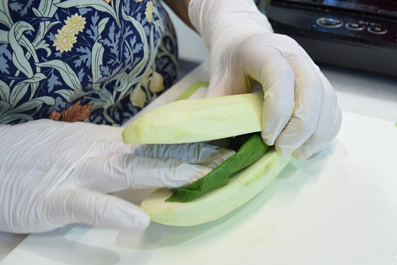 1 ナスはがくにぐるりと切り込みを入れ=上写真=皮をむき、しばらく薄い塩水にさらす。ナスの水分をよく拭いて、厚みの中心に縦の切り込みを入れる。切り込み部分にバジルを挟む=下写真。ズッキーニは1.5cmの厚さの輪切りにする。