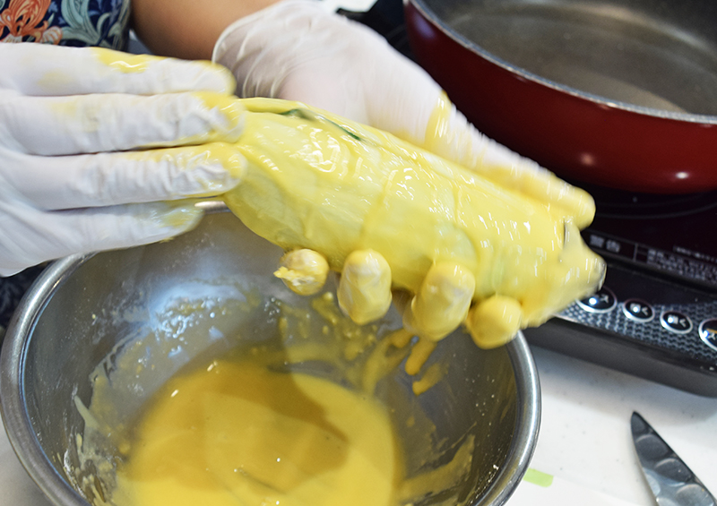 2 卵と薄力粉を混ぜ、ナスとズッキーニの表面全体を練り衣で覆う=写真。パン粉を付ける。