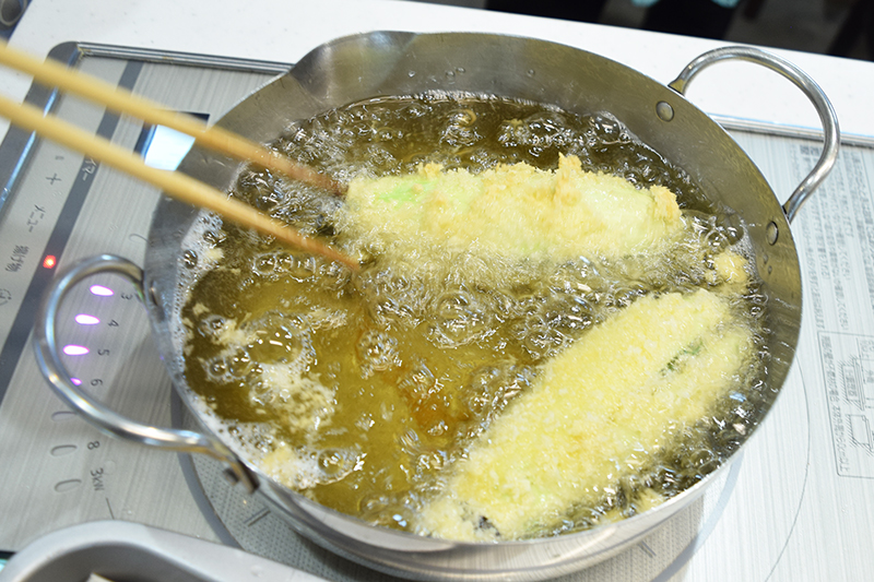 さい箸を軽く水でぬらして、布きんで拭きとります。その後油の中に箸を入れ、泡の出方で油のおおよその温度を調べます。