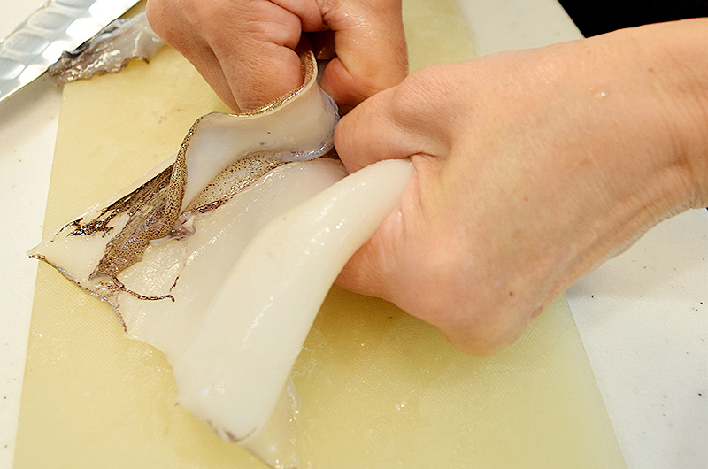 2 イカの薄皮をはいで取り=写真、繊維に逆らって長さ6センチ、幅1.5センチに切る。ゲソも長さ6センチに切りそろえる。大きいイカの場合はゲソに塩を振って指でもみ、吸盤を落とす。