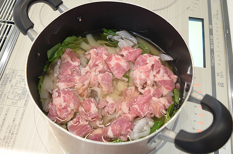 5 鍋にニガナを敷き、その上にイカ、豚肉を重ね分量のだしを入れて火にかける=写真。沸騰するまでは強火にしてあくを取り、あとは弱火にして30~40分ほど煮込む。