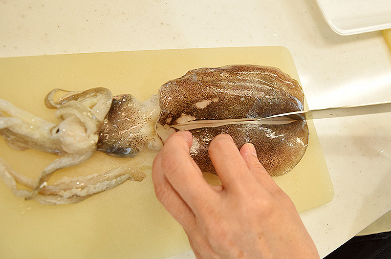 1 イカの背を上にして、中央に切り込みを入れる=写真。