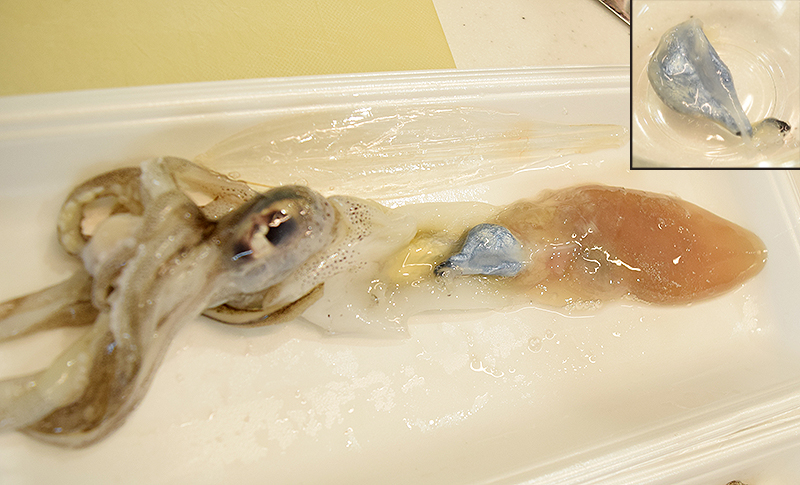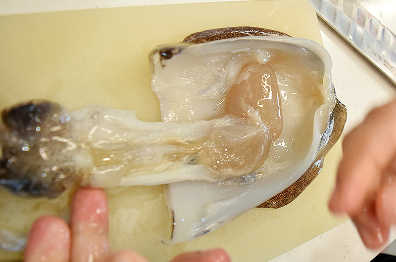 2 軟甲を抜き取った後=上写真、墨袋をつぶさないようにワタを胴から取り除く=下写真。