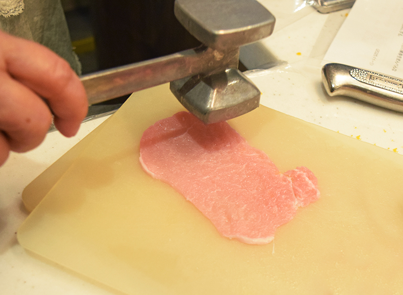豚背ロースは脂身を除いて縮まないように肉たたきで表面を均等に整える=写真