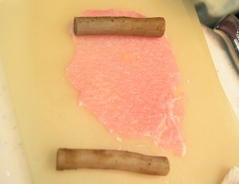 ゴボウを芯にして豚背ロースでくるくる巻く=写真