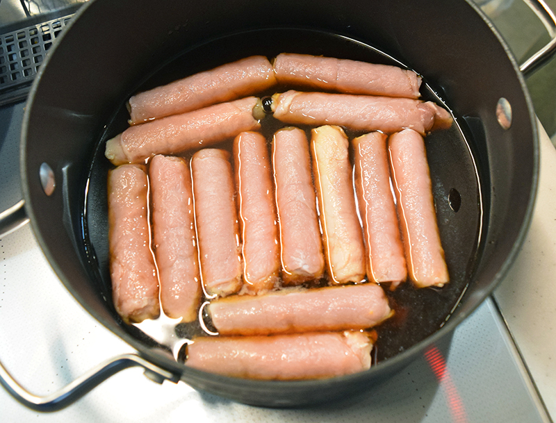鍋に分量の調味料を煮立て、ゴボウの巻き目を下にして丁寧に並べ、落としぶたをして弱火でゆっくり煮る=写真。途中でゴボウ巻きを一つずつ離しながらあくをすくい取る。最後に中火にして、つやを出して仕上げる。