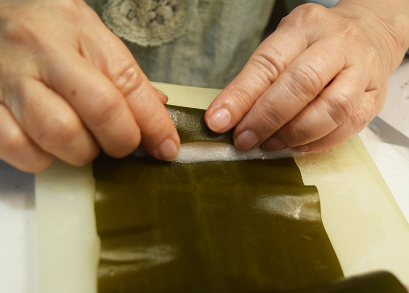 アンダアチーは昆布の幅に合わせて1.5~2センチ角の棒状に切り、これを芯にして昆布でくるくる巻く=上写真。巻き目が外れないように5~6本ずつボタン糸を結わえてまとめる=下写真