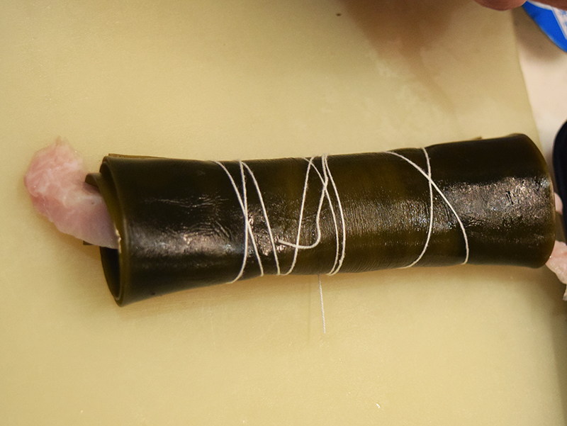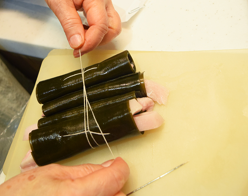 ・昆布巻きは魚を芯にしてしっかり巻きましょう。巻き目が外れないように竹串や糸でまとめます=写真