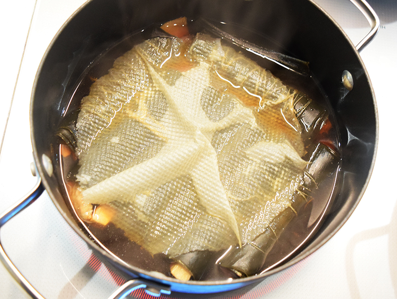 鍋にかつおだし、酒、砂糖を入れて火にかけ2の昆布を並べ入れてある程度軟らかくなるまで落としぶたをして煮る=写真。煮汁が半カップほどになったら塩、しょうゆを加えてさらに煮込んで味をよく浸透させる。