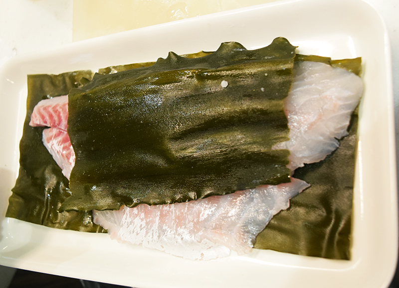 鯛は三枚におろして酒と薄塩をふり、昆布で2~3時間しめておく=写真。一晩ほど置くとよりおいしくなる。