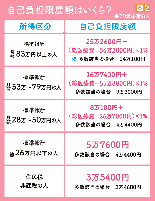 ②自己負担限度額は所得によって違う…自己負担の上限額は、被保険者の所得区分に応じて異なります=図2。70歳以上の場合は、上限額が変わります。
