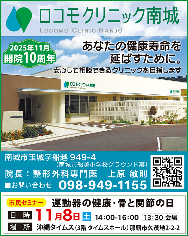 ロコモティブ症候群(以下、ロコモ)による移動能力の低下は加齢だけでなく、さまざまな原因で引き起こされる。内科的な病気が関わる場合もあるという。ロコモクリニック南城の院長、上原敏則医師は「歩きづらいと感じたら年のせいと放っておかず、病院で検査をして治療することがロコモ予防につながります。運動を習慣づけ、筋肉と骨を維持することも大事」と話す。