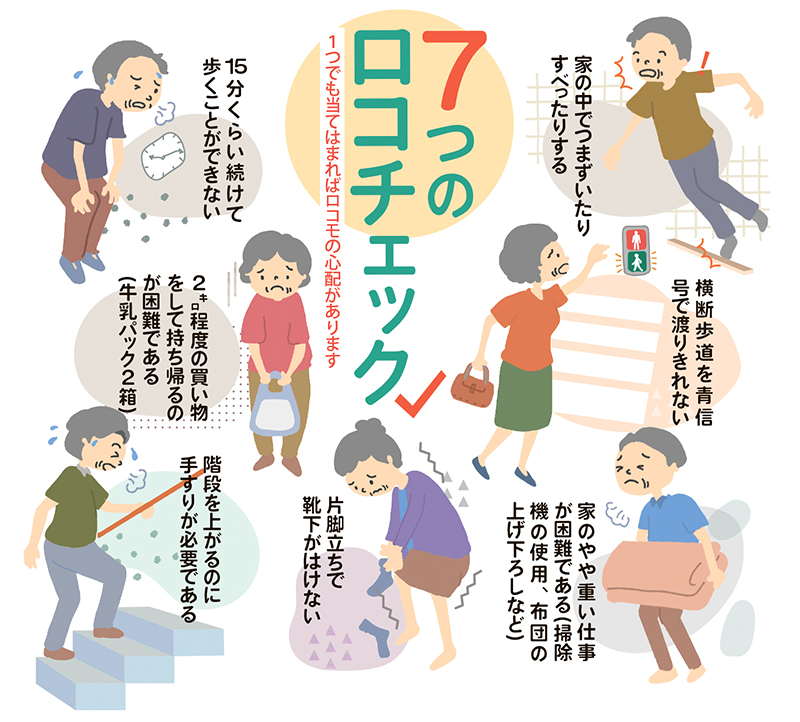 「最近動きにくくなった」「歩くのがつらい」と感じた時は、年のせいだと放っておかず、病気が潜んでいないか早めに病院で検査を受けて、原因を突き止めることが重要です。また、本人はロコモに気づいていないことも多いため、ご家族など周りの方も、歩く様子や動きに「いつもと違う」「おかしいな」と感じたら、ぜひ声をかけて受診を促しましょう。下はロコモの兆候を調べるチェックリストなので参考にしてみてくだい。ほかにも、台に座った状態から両足や片足で立ち上がれるかでロコモの進行度合いを測るテストなどがあります。