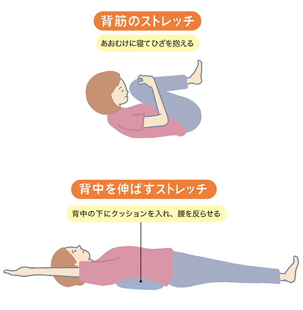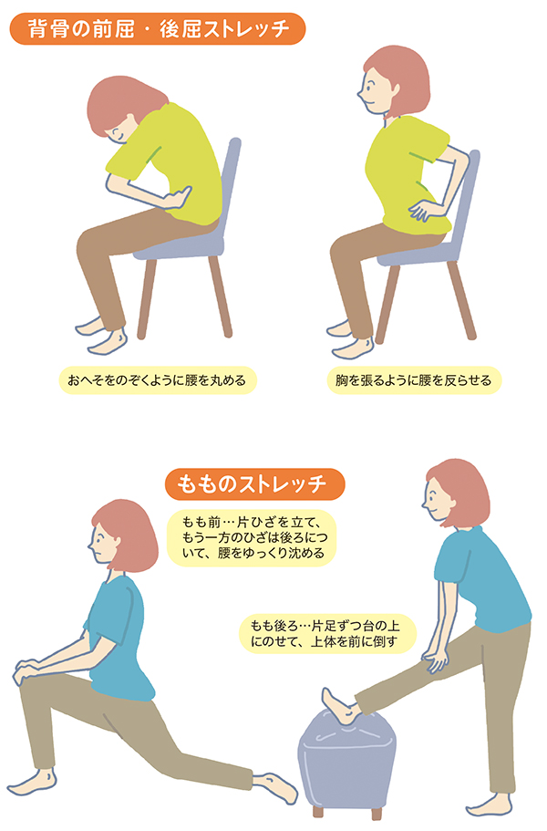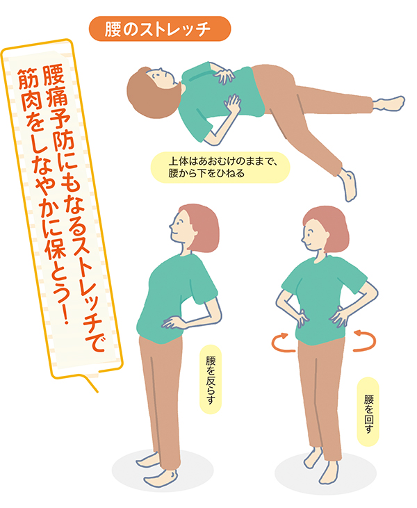 ストレッチは、筋肉をしなやかにして体の動きがスムーズになり、関節の可動域が広がります。足など一部の箇所だけでなく全身をまんべんなくストレッチするのがポイントです。右で紹介している体操は腰痛予防にもなります。合わせて腹筋や背筋を行うとより効果的です。