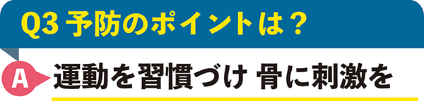 転 倒や寝たきりのリスクが高まります。特に転倒は、大腿(だいたい)骨近位部骨折などの大きなけがにつながりやすく、寝たきりの原因になりかねません。転倒を防ぐためには、歩くことに困難を感じて転びそうになるなど自覚症状があるのなら、まずその原因を調べて治療することが第一です。もし転倒したとしても、骨折のリスクを抑えるために日頃の生活習慣によって骨を丈夫にしておくことも大切です。