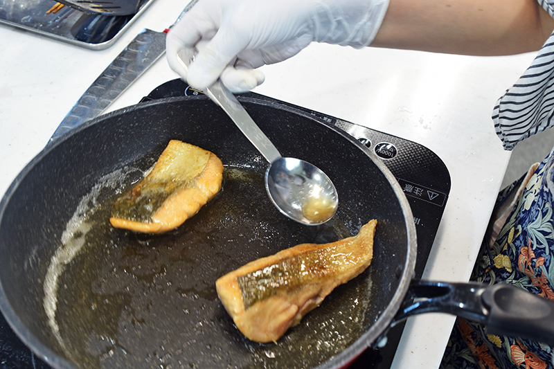 2 フライパンにオリーブ油をなじませ熱し、バターを入れて溶かす。表になる面から魚を焼き(中火)=上写真、全体に焼き色がついたら返して裏面もよく焼く(中火弱)。ときおりバターを回しかける=下写真。盛り付けのお皿に取る。