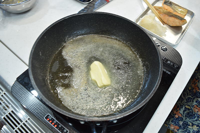 3 フライパンの油を軽く拭き取る。バター、塩、こしょうを入れて中火強の火加減にかける=写真。少し色づいてきたら火を止め、レモン汁を入れて味を調える。