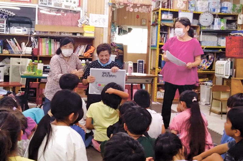 学童で子どもたちにしまくとぅばを指導をする女性会員