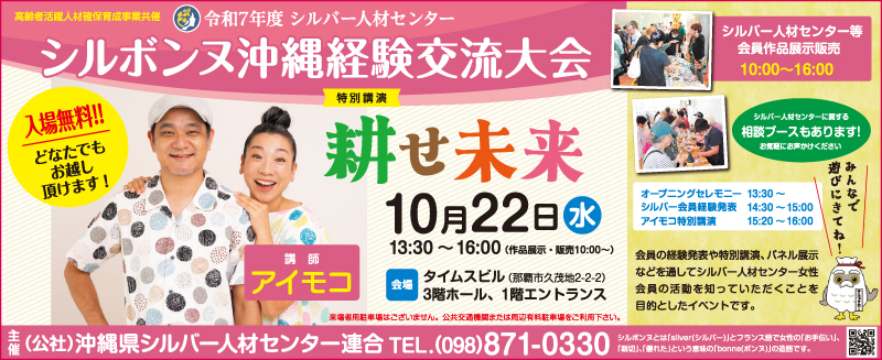 今年は22日に那覇市久茂地のタイムスビルで、ご夫婦で活躍中のミュージシャン&タレントのアイモコさんが特別講演。毎年行われる女性会員の体験発表や活動紹介は、他地域の会員と広く交流できる場として好評。会員が手作りした作品の展示販売も喜ばれています。また、平均年齢74歳とは思えないロックコーラス隊「ワンボイス」のパワフルなオープニングセレモニーも見どころの一つです。入場無料でどなたでも参加可能ですので、ぜひお越しください。