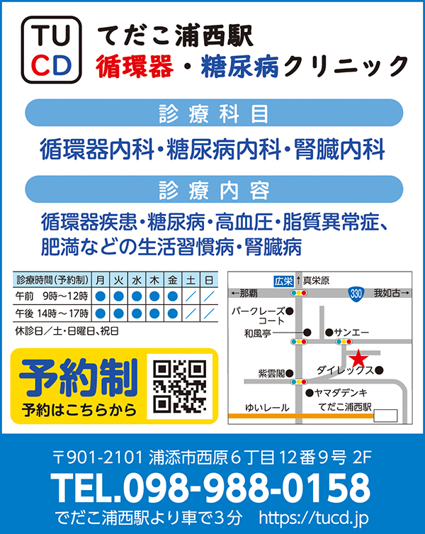 糖尿病が進行するとさまざまな合併症のリスクが高まる。てだこ浦西駅 循環器・糖尿病クリニックの院長、福地万里医師は「症状なく進行するので、健康診断などで血糖値をチェックして予防に努めましょう」と呼び掛ける。同院の医師で福島県立医科大学教授の島袋充生医師は「糖尿病を発症後、速やかに治療を始めて継続することが合併症の予防につながります。治療には血糖だけでなく、血圧、脂質のコントロールが大事」と話す。