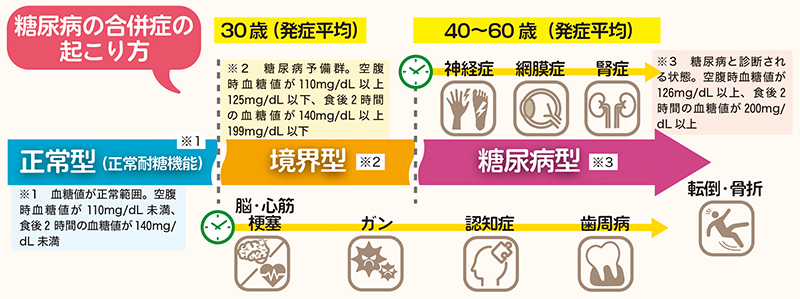 糖尿病の悪い状態が長期間続くとさまざまな慢性合併症が起こります=上図参照。三大合併症と呼ばれる神経症、網膜症、腎症は、糖尿病の発症後10年~20年かけて症状なく進行することが特徴です。動脈硬化による脳梗塞や心筋梗塞、がん、認知症は、糖尿病になると進行しやすい病気で、糖尿病予備群と言われる境界型から進行します。また、高血糖によって骨の質が悪くなって骨折しやすくなり、神経障害や視覚障害などで転倒のリスクも高まります。