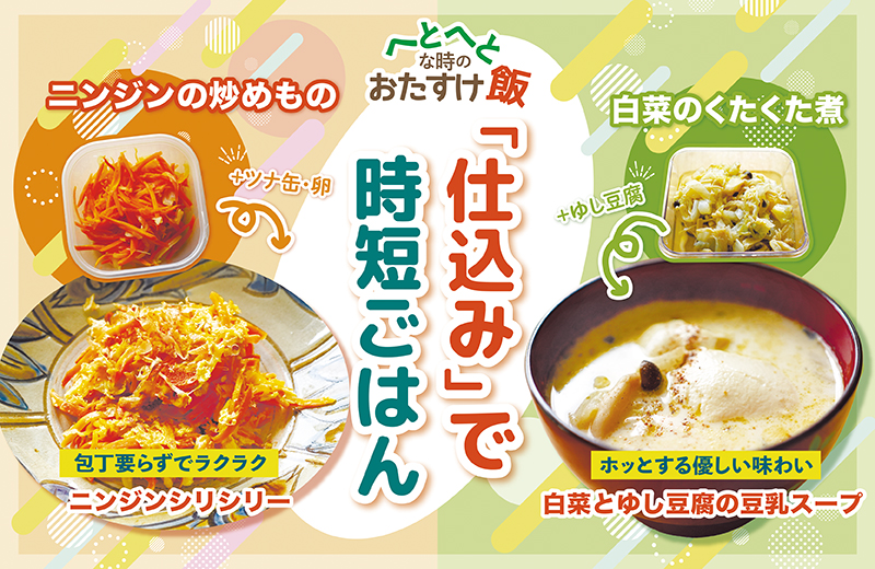 「ニンジンの炒めもの」は万能おかず。ツナや卵を加えると「ニンジンシリシリー」、豆腐や他の野菜と炒めれば「野菜チャンプルー」、甘酢であえると「ニンジンサラダ」に変わる。「白菜のくたくた煮」は、ゆし豆腐やサバ缶を加えるだけで具だくさんスープに変身。野菜とタンパク質を一緒に取れる栄養バランスのよい一品だ。