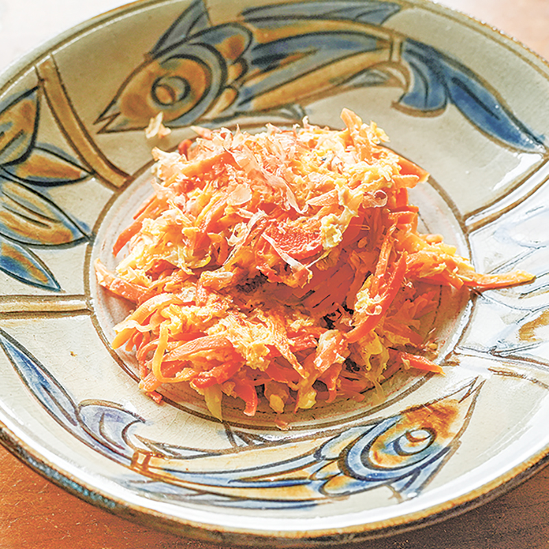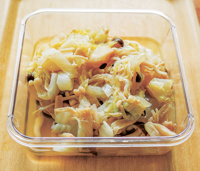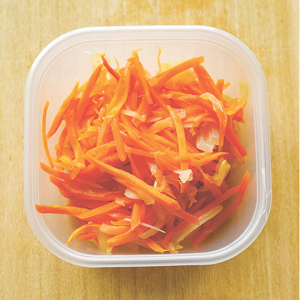作り置きの定番は野菜がメーン。中でも重宝しているのが、「ニンジンの炒めもの」と「白菜のくたくた煮」。野菜だけで作るため傷みにくく、冷蔵で3~4日保存できる。「作り置きがあれば、アレンジして調理をする際に野菜を洗う、切る手間が省け、加熱時間が短くなります」と與古田さん。