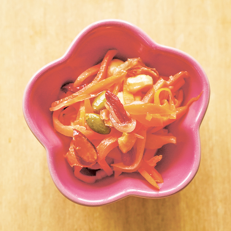 1 ニンジンの炒め煮にAを加えて混ぜる。好みでミックスナッツを添える。